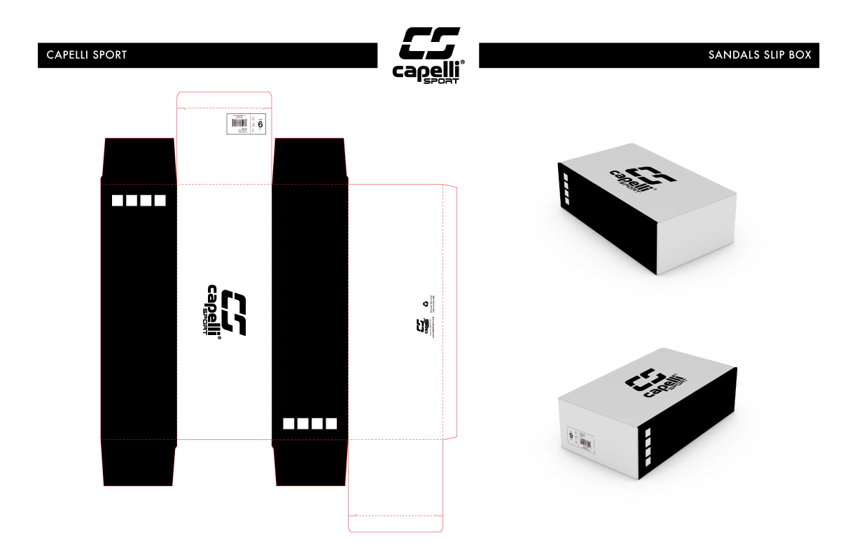 Product packaging design for a Soccer Slipper shoe box, including full die line layout as well as 3-dimensional product mockup views.